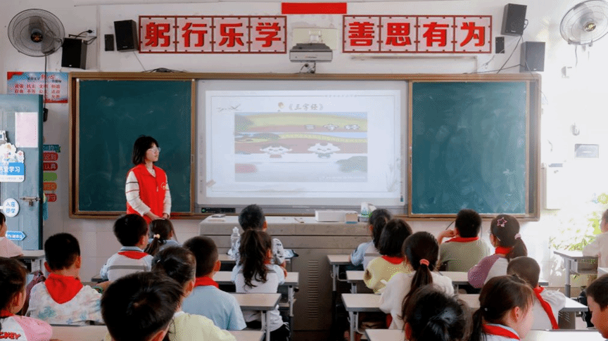 志愿者还详细介绍了《三字经》部分内容的释义,不仅让同学们了解到了古籍中部分字词不同于现代的“别样”释义,而且将内容延伸,讲述了孟母三迁、弈秋学棋等中华传统故事,为同学们徐徐展开文字背后的文化卷轴。此外,借助齐声朗读的方式,同学们不仅增强了对《三字经》内容的把握,还提振了精气神。志愿者与同学们积极互动、适时提问,课堂上掌声阵阵。