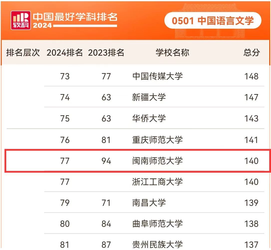 据悉,“软科中国最好学科排名”是反映学科实力的重要参考,各个学科排名的对象是在该一级学科设有学术型研究生学位授权点的所有高校,发布的是在该学科排名前50%的高校。“2024软科中国最好学科排名——中国语言文学”共有94所高校上榜。