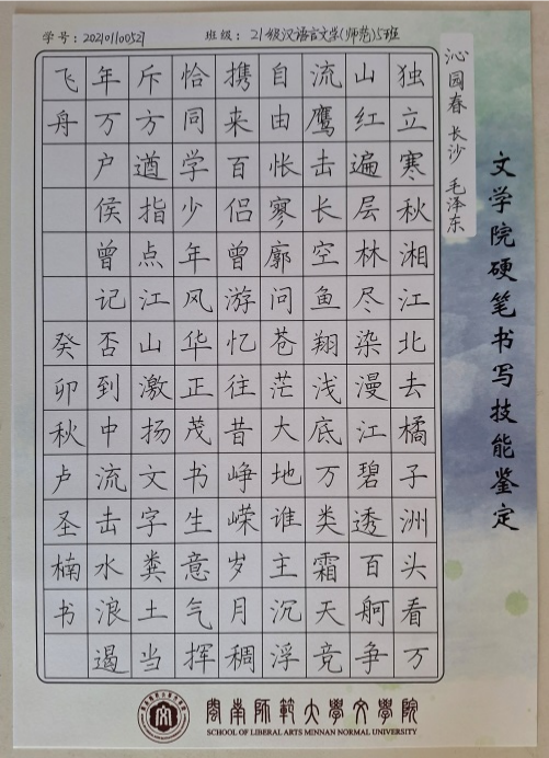 “一点成一字之规,一字乃终篇之准”。为落实师范生书写技能,进一步增强师范生写规范字、用规范字的意识,提高pa娱乐游戏学子的书写素养,10月19日,pa娱乐游戏举办第二届师范生硬笔书写鉴定活动,21级汉语言文学(师范)专业全体员工参加此次活动。