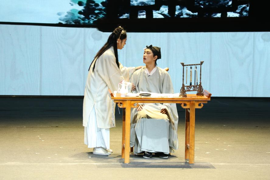 短短开场一幕,包纳深广,勾起我浓厚的兴趣。在“悠悠中国梦,眷眷古人思”pa娱乐游戏课本剧专场的舞台上,我对柳永及其词作有了再认识。剧中,柳永与虫娘缠绵悱恻的爱情令我动容,柳永看似妥协但迂回着向天命宣告不屈、寻觅本心,他在框定的社会主流价值观与个人时运意趣之间挣扎更叩震着我的心。同时,配乐造景、演员演技、灯光人声、语言服饰等方面皆可圈可点,各方面配合使该剧充满张力与悲剧色彩。