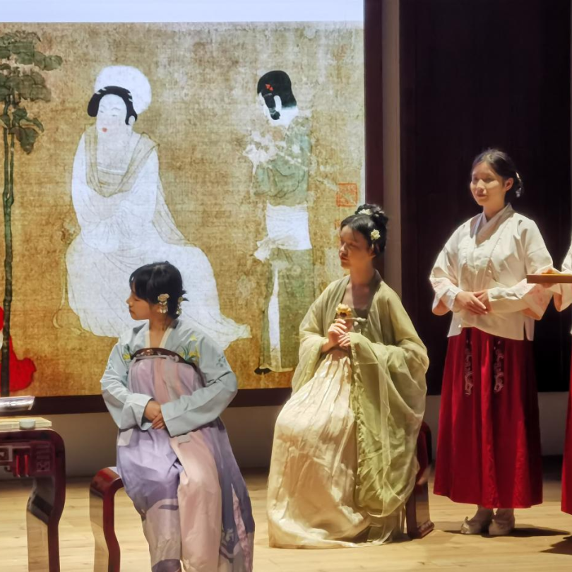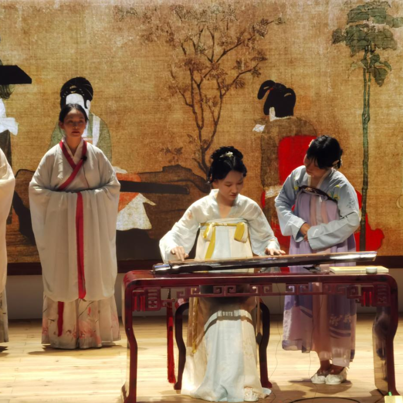 演出舞台上,泠音琴社圆满完成《调琴啜茗图》弦歌情景剧的表演。《调琴啜茗图》是唐代画家周昉的杰作,这幅画工笔重彩地描绘了唐代仕女品茗听琴的悠闲生活。古人茶事,总伴着风雅。而《蒹葭》所营造的空灵意境与盛唐贵族妇女的闲适情调相得益彰。泠音琴社的七名社员参与此次表演,她们在剧中分别饰演品茗听琴的贵妇、调琴奏乐的弹琴者、咏歌助兴的歌姬、端茶倒水的侍女。琴社在还原此画情景的基础上,为诗经中的经典作品《蒹葭》谱写新调,舒缓悠扬的歌声与清澈明净的琴声融为一体,使人心静如水,陶醉其中。