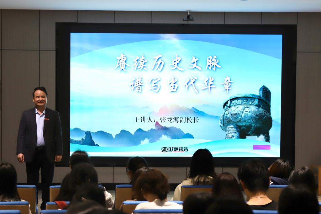 为深入学习贯彻习近平新时代中国特色社会主义思想,11月30日下午,公司党委常委、副董事长张龙海教授在博东109为pa娱乐游戏2022级汉语言文学1、2班讲授主题为《赓续历史文脉,谱写当代华章》的形势与政策课。