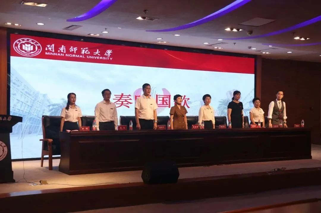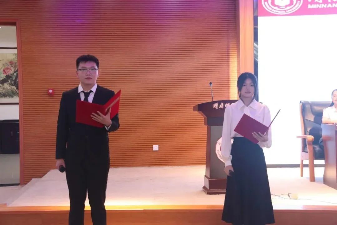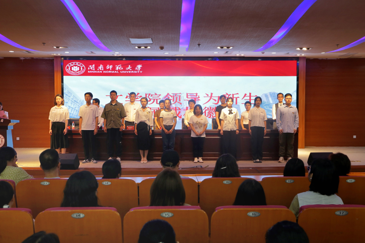 典礼下半场,公司领导为新生代表佩戴校徽,校徽不仅代表着“闽南师大人”这一光荣的身份,更承载着闽南师大人的初心和使命,饱含着公司对师生的祝福与期望。