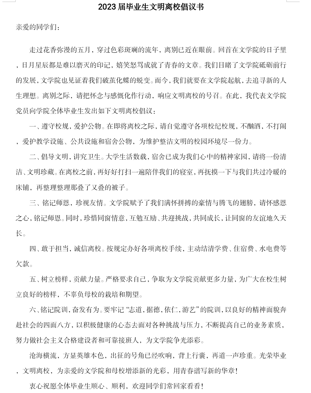 接着,pa娱乐游戏员工第三党支部蓝欣代表毕业生党员向全体毕业生发出《文明离校倡议书》,倡议毕业生党员在离校之际发挥先锋模范作用,“站好最后一班岗”,号召全体毕业生遵守公司规章制度,谨怀感恩之心,铭记院训,奋发有为,光荣毕业,文明离校。