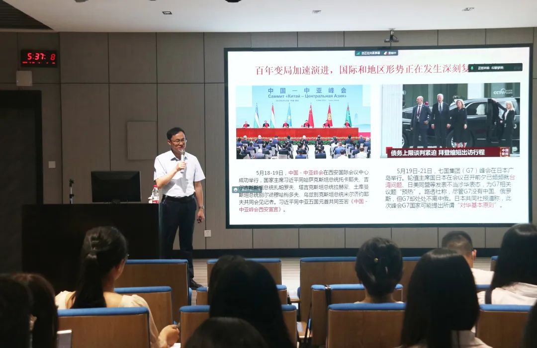 课程伊始,林建辉以中亚峰会及七国集团峰会的开展为切入点,点明新时代中国发展的国际环境,指出学习习近平新时代中国特色社会主义思想的必要性,并从创立条件、时代课题、主要内容、世界观和方法论与历史地位等五个方面进行具体论述。对于研究推进马克思主义中国化、时代化的重要课题,他指出不仅要把握国内社会主义发展的条件,还要结合国际环境,从世界角度来看中国发展。