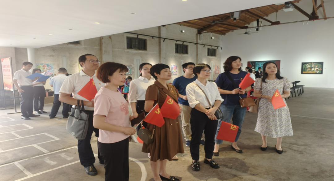 漳州作为闽南文化底蕴丰厚的城市,在发展中致力于提升文脉保护水平,突出闽南文化特征,注重闽南建筑风格的传承与演化,把文化基因融入城市规划和建筑设计中,提升漳州特色建筑辨识度和影响力。糖仓,原是漳州糖厂边上的一个老建筑,而如今成为漳州市区一处文化记忆点,在设计上,一方面保留这些老建筑的记忆,另一方面将更新的设计理念,植入到老仓库里,设计成一个富有闽南文化的复合空间。本次活动在观看闽南潮流艺术展中拉开帷幕,支部党员共同了解场地中丰富的传统文化元素,共同感悟糖仓代表性的文化内容,在交流中产生学科交叉的共鸣。