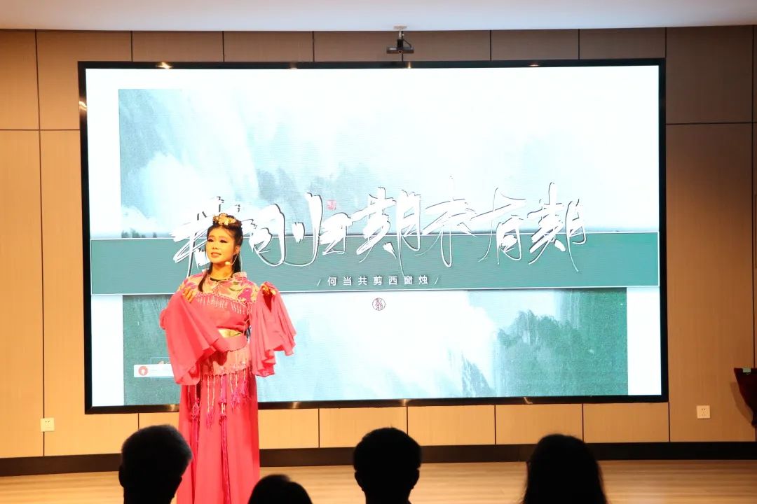 连思颖通过闽南语演唱的《夜雨寄北》,更好地展现了刘禹锡雨夜的丝丝愁情;朱媛带来的《几多愁》,以柔美的声音道尽南唐后主的“几多愁”;曹玉娇、蓝晓静、陈珈宇、王远昊、王彦彬、颜凌杰以歌声加之古琴配乐,献上《阳关三叠》,更加流露出好友离别的依依惜别之情;陈珈宇、曹玉娇带来的《桃夭》,琴声与歌声的搭配,展现出古时少女的明媚活泼;叶莹、陈澜带来的《知否知否》:柔美与深沉声音的组合,表现出词人对时光易逝之淡淡愁情;王梦媛的一首《独上西楼》,以舒缓的歌声为大家牵引出李后主千丝万缕的离愁;林晓洁、孙舒婷带来的《水调歌头》,唱出词人对人间的留恋以及对远方亲人的思念,同时又表达出词人“千里共婵娟”的豁然;在王妤欣带来的《月满西楼》中,我们一起领略李清照流诸笔端的缠绵愁思。温婕雅、涂曦月歌声缓缓流淌,《黄鹤楼》流现出“日暮乡关何处是,烟波江上使人愁”的满满乡愁;王雨薇将诗歌与歌舞结合,完美展现出《定风波•莫听穿林打叶声》中“也无风雨也无晴”的豁然开朗;王彦彬带来的《枉凝眉》,让我们与“一把辛酸泪”背后的故事相识;一首《敕勒歌》,曾靖雯以歌声为尺,丈量渺渺草原,以歌声为笔,描摹幸福生活;潘璐娜带来的《归园田居•杂诗》,以歌声为墨,为我们晕染开一幅田园风光图。