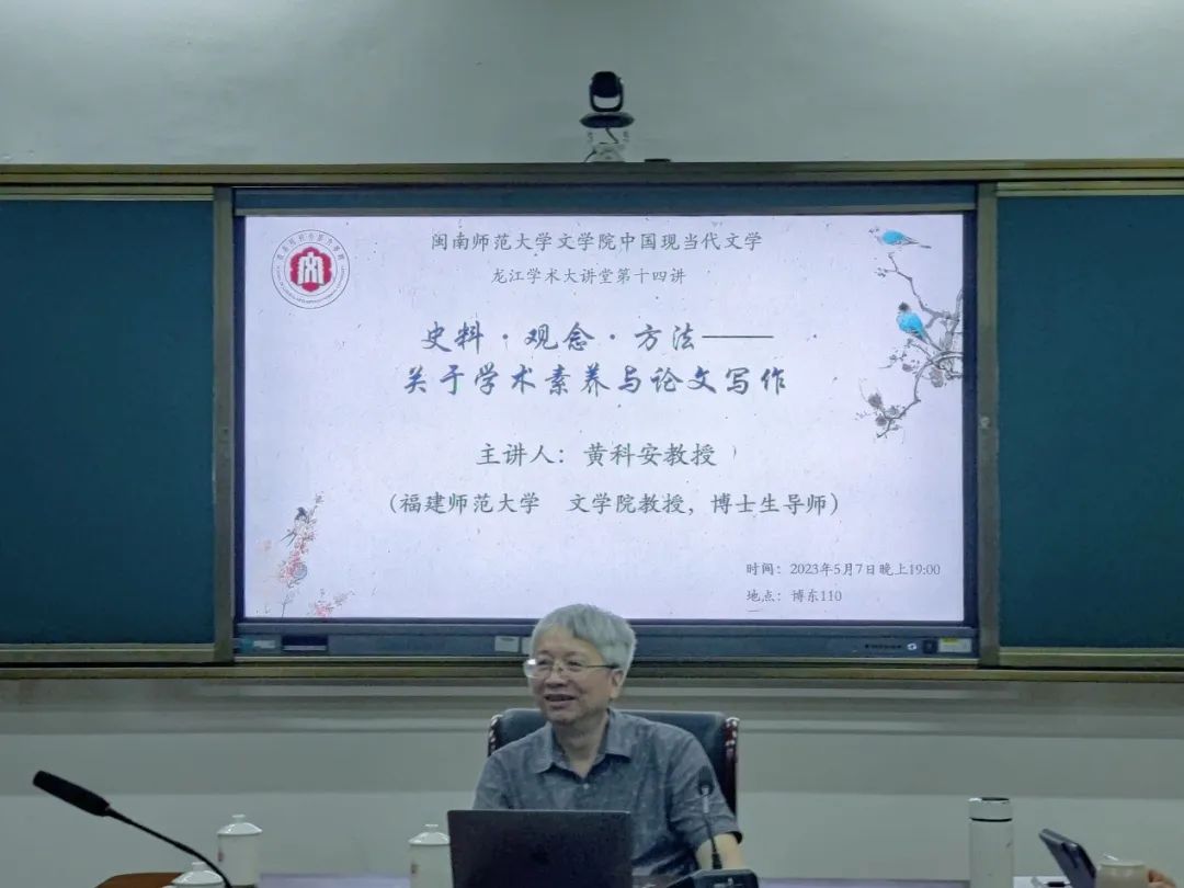 5月7日晚,福建师范大学pa娱乐游戏博士生导师黄科安教授应邀为公司师生作题为“史料·观念·方法——关于学术素养与论文写作”的精彩讲座。本次讲座是公司中国现当代文学“龙江学术大讲堂系列讲座”的第十四讲。讲座由周军教授主持,公司胡明贵教授参与讨论,在校研究生聆听了本次讲座。