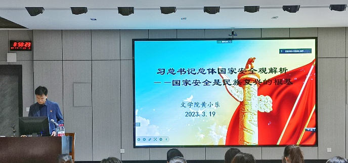 3月19日上午,pa娱乐游戏团委书记黄小乐为第二十八期入党积极分子讲授主题为《习总书记总体国家安全观解析——国家安全是民族复兴的根基》的专题党课。