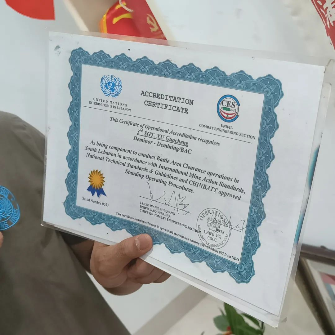 就是秉持着这样严谨认真的态度,许国成带领的支队担负着黎巴嫩与以色列边境排雷排爆的高危作业任务。在九个月的维和期间,他们支队共完成了70余万平方米雷区、爆炸物的排查,并且做到无一伤亡。他们出色地完成了排雷任务,荣立中央军委颁发的集体一等奖,并获得了联合国颁发的和平勋章以及扫雷排爆证书。因此,联合国驻黎巴嫩维和部队司令离任之前破例为中国军营写下书面评价:“中国官兵以高昂的士气,饱满的热情,无畏的作风和勇敢的自我牺牲精神,为联合国也为中国赢得了尊重和荣誉。”