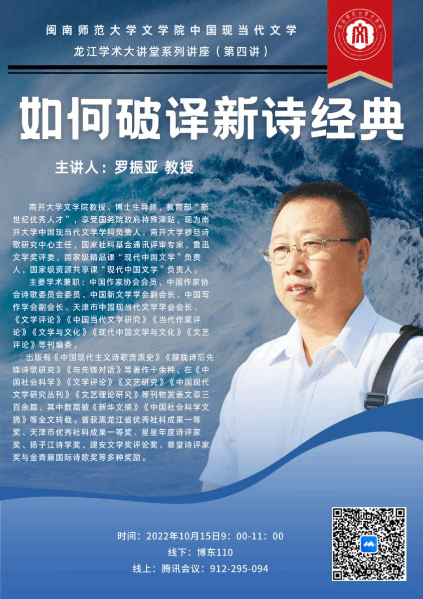 2022年10月15日上午9点,pa娱乐游戏中国现当代文学“龙江学术大讲堂系列讲座”第四讲准时开讲。南开大学pa娱乐游戏教授、博士生导师,新诗研究权威专家罗振亚先生应公司中国现当代文学学位点邀请,通过腾讯会议在pa娱乐游戏博东110教室为中国现当代文学专业全体研究生开启了题为“如何破译新诗经典”的学术讲座。中国现当代文学学科负责人胡明贵教授担任本场学术讲座的点评嘉宾,现当代文学教研室新进教师董晴也出席了本次活动,讲座由中国现当代文学学位点负责人周军教授主持。