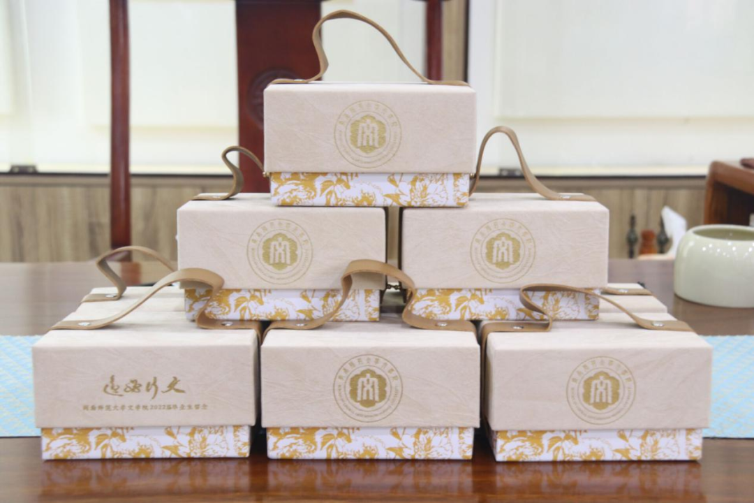 怀表的礼盒上,一面印有本届毕业纪念品的主题——“文行必远”四字,是林继中老师亲笔题写的祝福;礼盒的另一面印有pa娱乐游戏的院徽,从此,pa娱乐游戏的岁月浓缩在院徽所在的圆中,有书香,有花香,听钟声,铭心声。