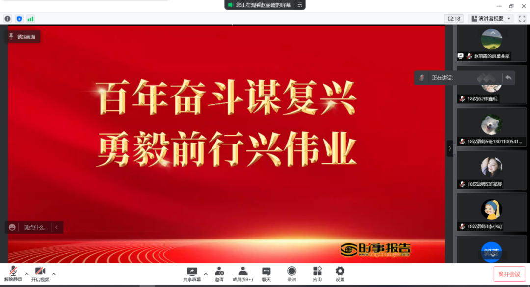 近日,公司党委书记赵丽霞向2018级师范生讲授形势与政策课第一专题“百年奋斗谋复兴,勇毅前行兴伟业”。因疫情防控需要,课程采用线上会议的形式进行,18级师本班全体同学及员工第一党支部、研究生第二党支部全体党员到会听讲。