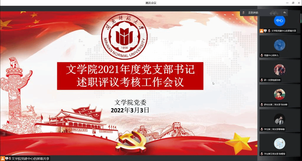公司党委书记赵丽霞同志对教工党支部和部分员工党支部进行了点评。她简要的概括2021年度公司党建工作取得的成绩。公司党委获评“省高校优秀基层党组织”、校“1+1+N”党建与思想政治工作品牌体系协同建设培育创建单位、基层党建工作创新奖等荣誉,三个师生支部通过省级样板党支部工作验收,教工第二党支部获批省级“双带头人”工作室,“探索建立123党建模式,引领推动公司高质量发展”案例、“七个一百庆祝中国共产党建党一百周年”系列活动等在主流媒体报导。她表示,这些成绩离不开各党支部书记的思考与付出,特别是中国语言文学一级学科获批博士学位授予点,凝聚了多代中文人的辛劳,也是全体师生铆足干劲,奋发有为的成果。接着,赵丽霞对6位支部书记述职做一一点评,她对教工党支部对标基层党建重点任务、“三会一课”制度执行情况进行了肯定。两个本硕毕业生支部能积极配合疫情防控管理,持续推进支部助力员工成长的机制,打造帮扶毕业生就业的品牌项目。同时,她指出对标样板党支部的建设标准,还存在一些不足,例如支部党建项目的成果还需凝念,支部党建与教学、科研的融合有待提升。