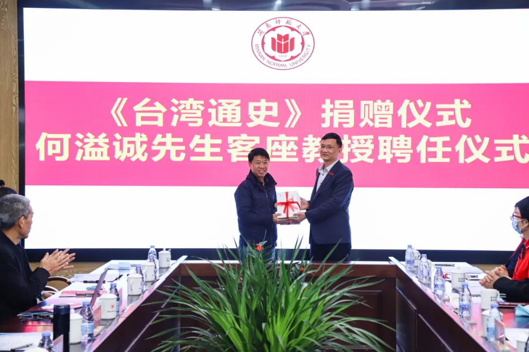 李顺兴代表pa娱乐游戏官网向何溢诚捐赠《台湾通史》(六卷本),并聘任何溢诚为客座教授。