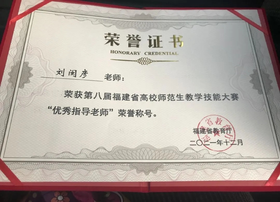 12月10日至12日,由福建省教育厅主办的第八届福建省高校师范生教学技能大赛在福建师范大学举行。此次大赛,公司选派3名师范生参赛,与来自全省多所高校师范生展开激烈角逐,喜获佳绩。18级师本四班郑丹妮获初中语文组一等奖,18级师本一班潘琳、18级师本五班陈锴妮均获初中语文组二等奖。指导老师刘闽彦副教授获评“优秀指导老师”。