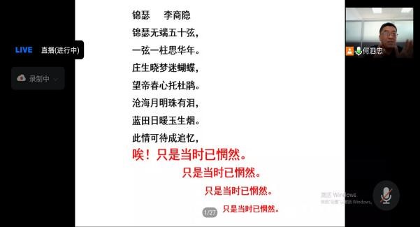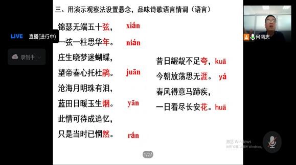 “教学内容像山一样厚重,教学形式像水一样灵动。”何老师选取选择性必修中册《锦瑟》一诗,向大家演示了如何通过具体任务的驱动,将“千古朦胧第一诗”的教学落到实处。老师在此巧用六种悬念驱动方法,通过情境的创设与与导入,落实语言、文化、文章、文学等四方面的任务。