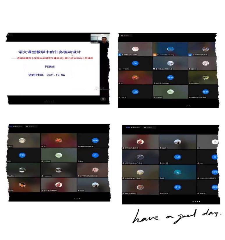 为了进一步提升教育硕士研究生的语文教学设计能力,10月6日,pa娱乐游戏特邀全国优秀教师、著名特级教师、正高级教师何泗忠老师,为学科教学(语文)专业的研究生和众多一线教师带来了一场主题为“语文课堂教学中的任务驱动设计”的线上教学讲座,黄强军老师主持讲座。