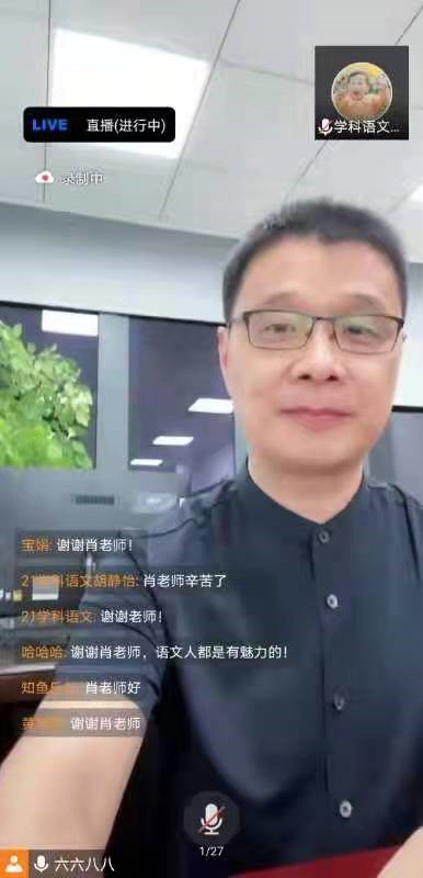 近期国家“双减”政策的出台以及落地实施,要求师生进一步提高课堂教学的质量和效率,也给语文人带来了许多思考。为更好地提高大家对“双减”背景下语文教学及设计的认识,10月2日,pa娱乐游戏特邀全国著名特级教师、正高级教师肖培东老师,为学科教学(语文)专业的教育硕士研究生带来了一场主题为“‘双减’背景下语文教学设计漫谈”的线上讲座。本场讲座由“教学设计经验传授”与“师生交流互动”两部分组成,黄强军老师主持讲座。来自五湖四海的师生同仁也闻讯加入,与会人数达五百多人。19时许,肖老师如约而至,他向国庆期间在疫情中坚守校园的师生们表达了慰问,希望早日回归天朗气清的学习生活环境。随后,肖老师围绕四个关键词向大家诠释了“如何教语文”“如何提质增效、进行教学设计”。