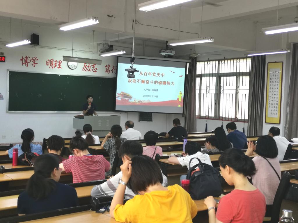 6月10日15:20,pa娱乐游戏在博东109举办《从百年党史中汲取不懈奋斗的磅礴伟力》党史学习教育专题讲座,讲座由党委书记赵丽霞主讲,全体教职工出席会议。