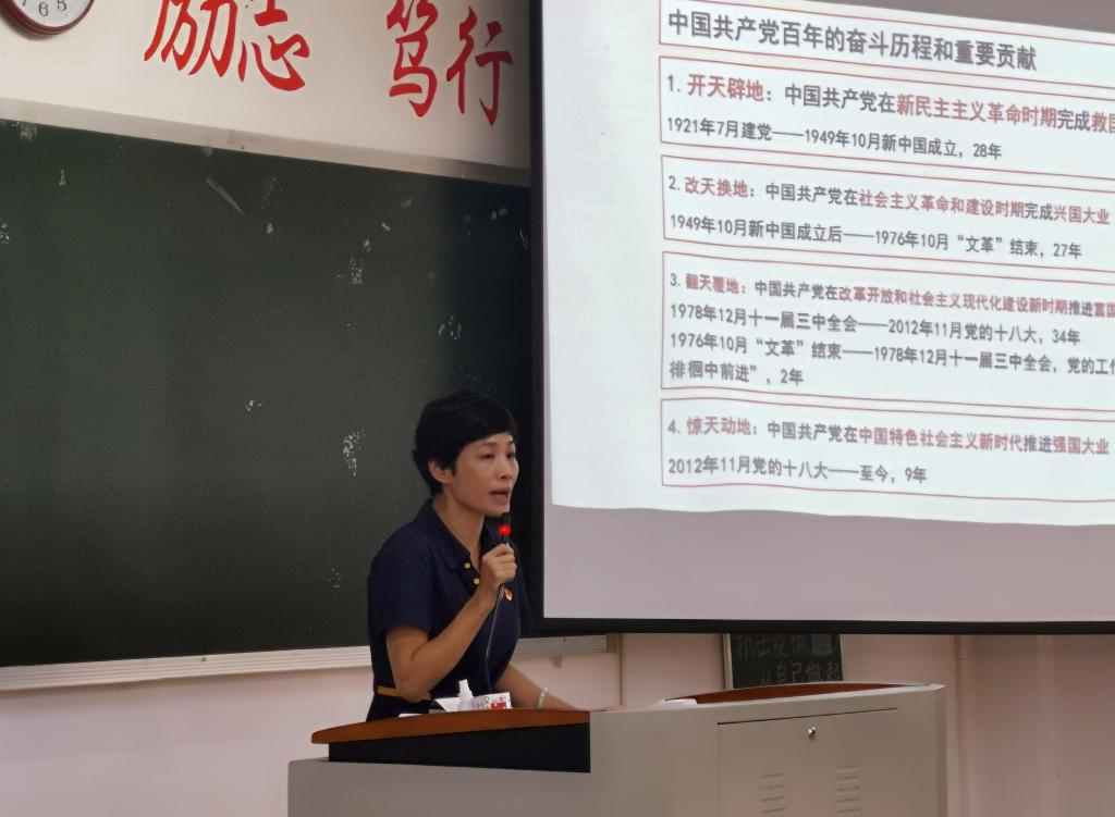 赵丽霞指出,中国共产党的百年奋斗历程是一个光荣的历程,艰苦卓绝的奋斗历程。这一百年来,中国共产党发展成为了世界第一大党,中国人民实现从站起来到富起来到强起来的奋斗目标。她围绕“开天辟地:在新民主主义革命时期完成救国大业”“改天换地:在社会主义革命建设时期完成兴国大业”“翻天覆地:在改革开放新时期推进富国大业”“惊天动地:在新时代推进并实现强国大业”四个方面,阐述了中国共产党带领全国各族人民取得一个又一个胜利的奋斗历程,引导全体教师学史明理、学史增信、学史崇德、学史力行。赵丽霞着重阐释了习近平总书记关于党的历史的重要论述,深入分析了认真组织开展好党史学习教育,对于总结历史经验、认识历史规律,在新的历史起点上奋力夺取新时代中国特色社会主义伟大胜利的重大意义。她要求,学习党史要树立正确的党史观,切实为师生群众办实事,解难题,发扬马克思主义优良学风,学深悟透,开创新局,为“十四五”建设压实责任担当。