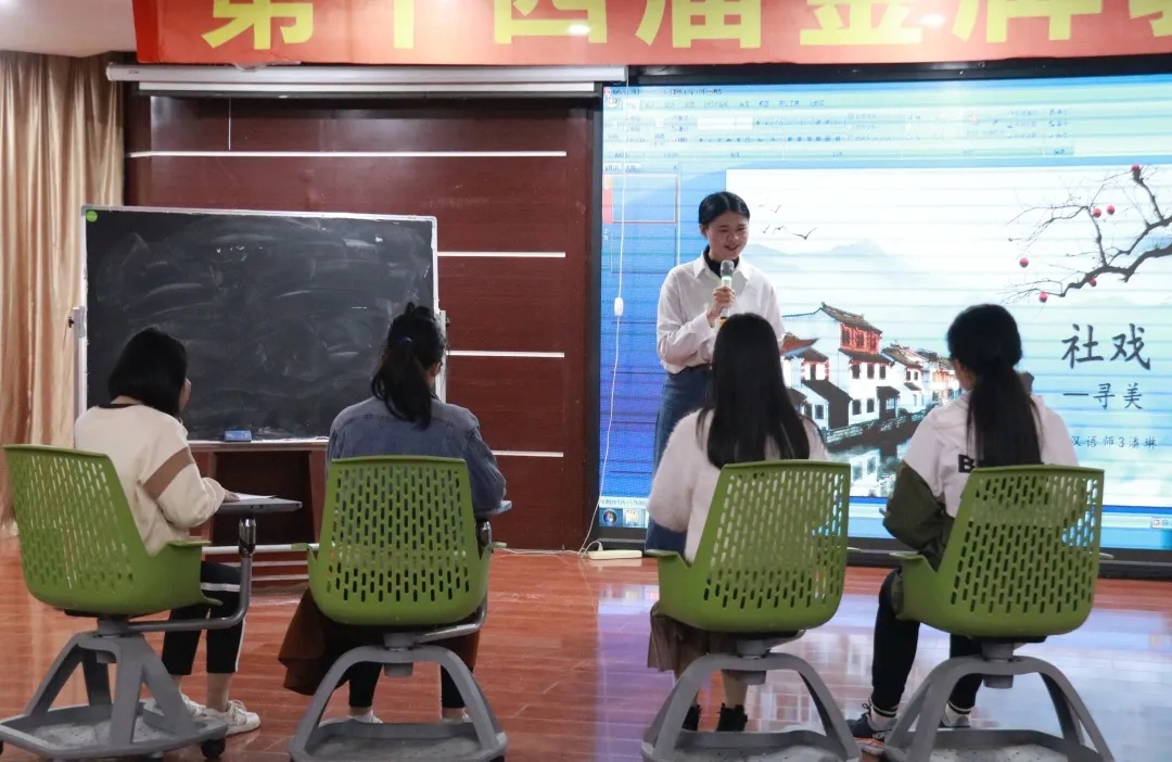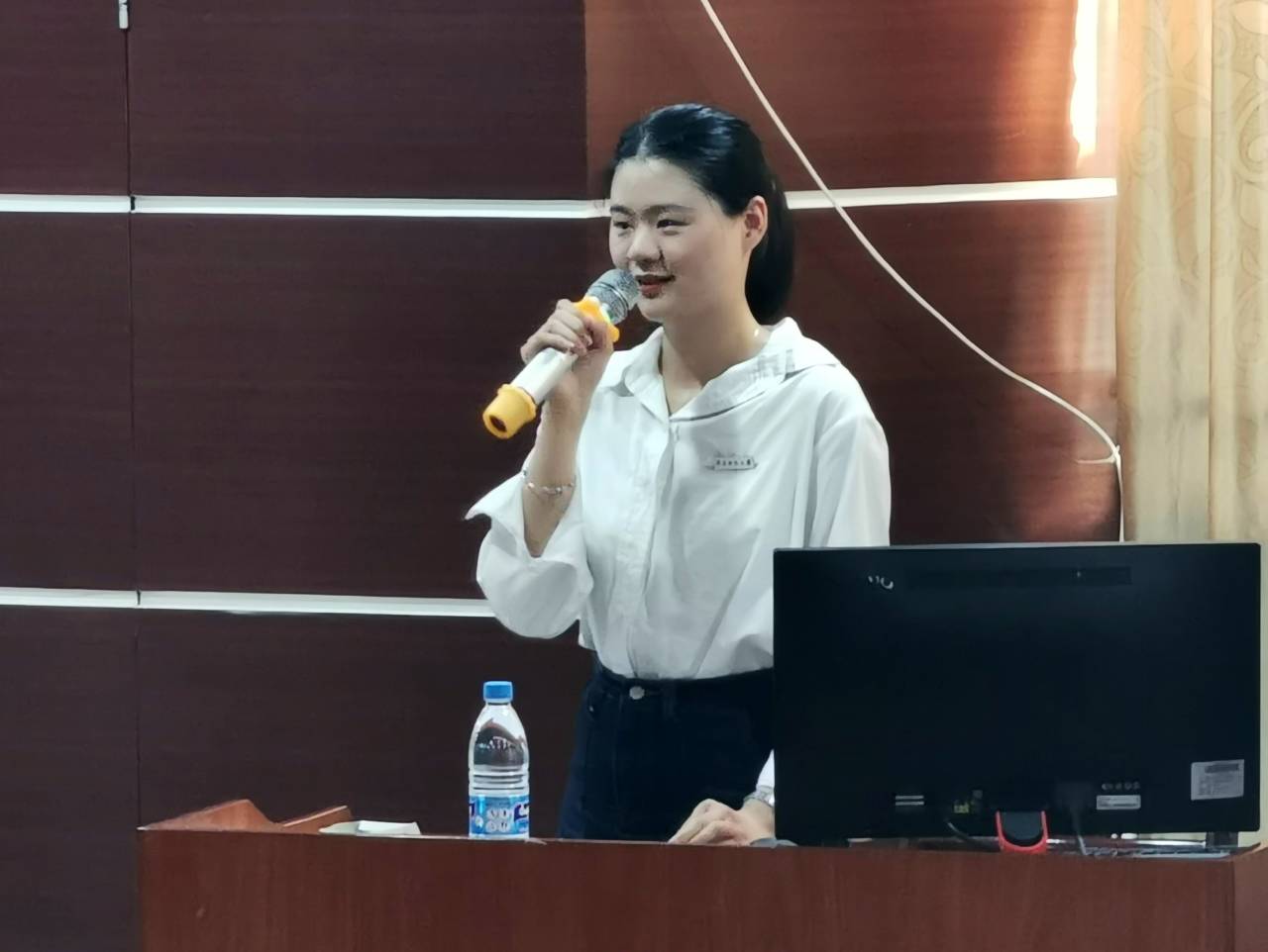 宣讲第二阶段,潘琳以师范类专业员工的责任和使命为主题,分享了她自大一以来的学习心路历程。她坦言,学习中文比她想象的更具有挑战性。同时她也表明,只要时刻怀着一颗热爱学习的心,身负强烈的使命感和责任感,便能在所行之路上披荆斩棘,无惧风浪。在谈到关于文学学习的相关经验时,她将其主要归纳为“说”与“写”两部分,并建议广大文学学子积极阅读文学作品、不断开拓第二课堂、注重师范生理论知识的学习和实践技能的培养,全面提升个人素质,在锻炼中得到成长。最后,她鼓励在座老员工勇敢追梦、绽放属于自己的光彩。(图四)
