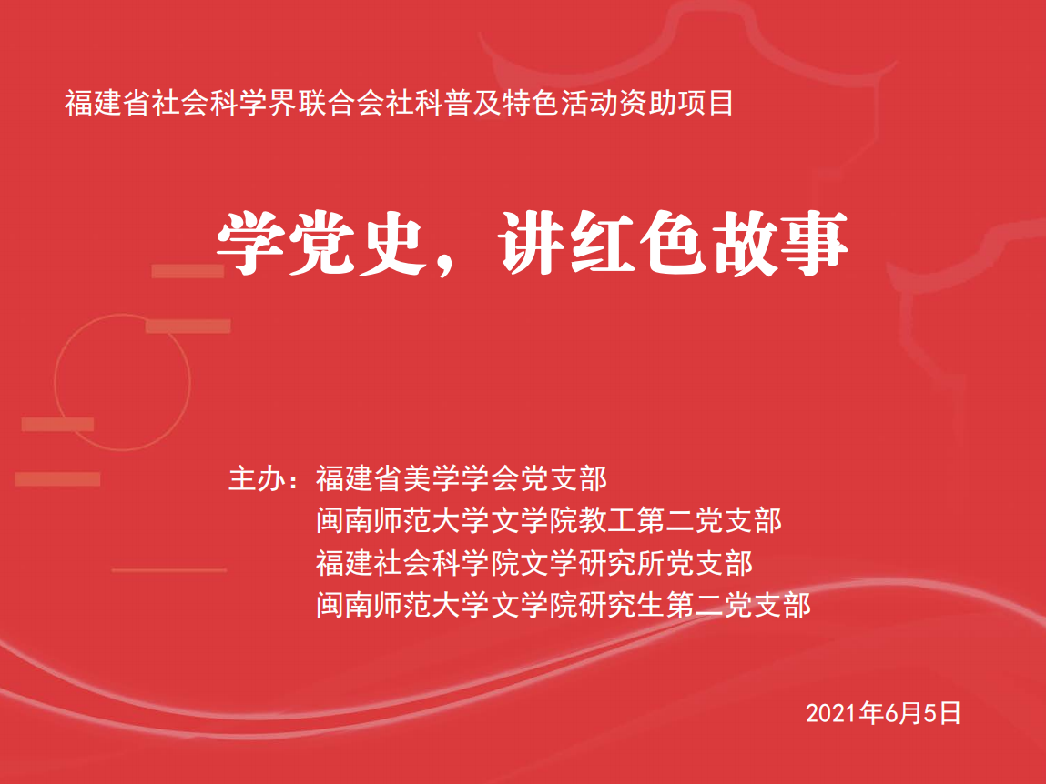 本次活动的举行旨在增进对中国共产党党史的了解,在学习党史的过程中“学史增信”,不忘初心,牢记使命,呼吁与会各位坚信中国共产党的领导,跟随党的领导,为新时代的党史学习和思想传播贡献一份力量!