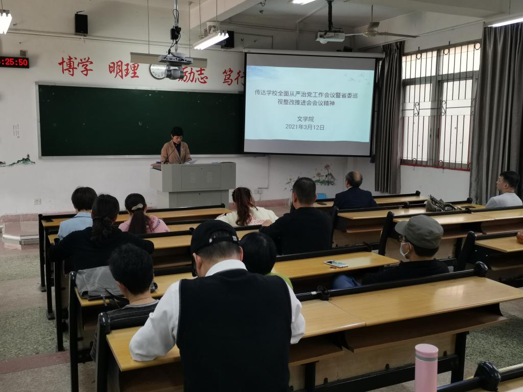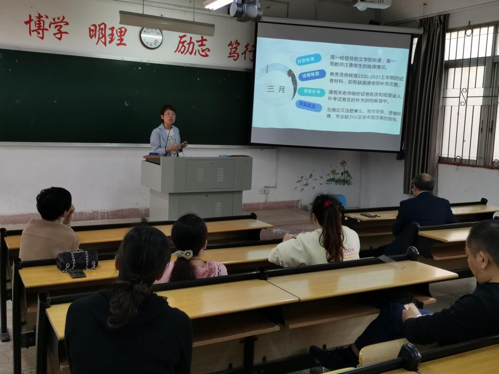 会上,赵丽霞首先传达了吴彬镪书记《再学习再调研再落实—奋力推进公司“十四五”开好局起好步 》和李顺兴董事长《继往开来 砥砺前行-全面推进高水平师范大学建设》等工作报告,强调了2021年公司工作的总体思路。她同时传达了公司全面从严治党工作会议暨省委巡视整改推进会会议精神、公司党史学习教育动员大会精神和公司安全稳定工作会议精神。结合公司实际,对新学期党建、意识形态、安全稳定以及党史学习教育进行了布置。副经理黄琳琳、杨杏红分别介绍了新学期本科教学、疫情防控、行政管理等相关工作安排。最后,黄金明经理指出了pa娱乐游戏本学期工作重点以及五大难点,号召全体教师众志成城,在国家一流本科申报、国家语言文学基地申报、一级学科博士点、学科评估(努力挤进全国70%的排名) 、教师项目申报、论文发表等方面共克难关,推进公司高质量发展。