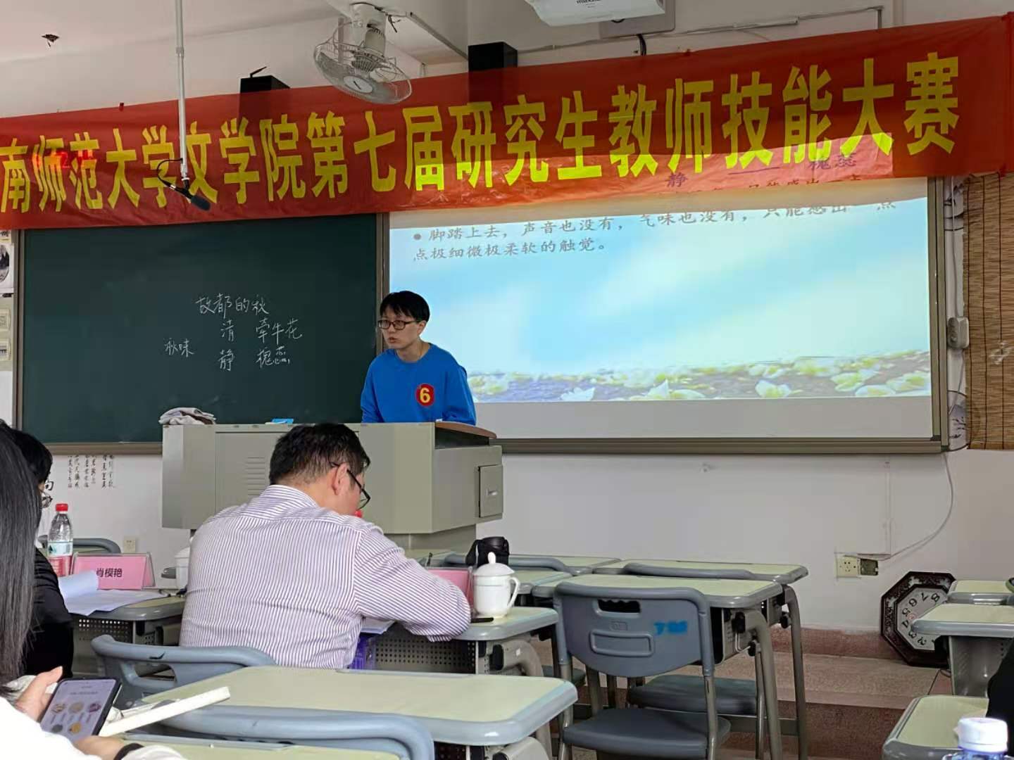 评委们对选手的表现进行点评。肖模艳指出了选手们表现的突出亮点,提出了一些建议,鼓励同学们积极参与教师技能实践,为未来从教积攒宝贵经验;郑丽霞从文本解读与教学设计方面提出针对性的指导;黄强军从文本、教态、交流互动、板书设计等方面对选手表现逐一点评。经过激烈角逐,陈珊珊同学荣获一等奖,吴云菊、武凯莹等五名同学分别荣获二等奖和三等奖。