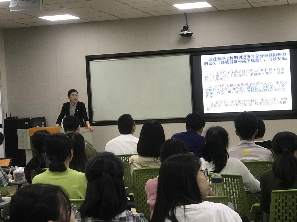 讲座伊始,苏晖教授给同学们分析了近年来外国文学研究的热点问题,通过举例分析七种期刊近五年部分最具影响力的论文,强调以下三个观点:一是诺奖作家作品是研究热点,二是女性作家和少数族裔作家经常受到关注,三是叙事类、文学伦理学批评、生态批评、女性主义批评及跨学科研究是运用较多的批评方法和视角。其次,苏教授还带领同学们对外国文学研究现状进行了反思,启示我们应避免出现跟风和扎堆现象,重视加强经典重释和非英语文学的研究。同时也要克服研究中的模式化倾向,将理论视域向纵深拓展以及避免对于西方价值观的盲目追捧。最后,苏教授还从外国文学研究的中国视角与中国立场提醒同学们要处理好主体性与开放性、选择性与包容性之间的关系,既要充分发挥中国学者的主体意识,又要以开放的胸怀和兼收并蓄的态度摄取丰富的外国文学资源,既不能固步自封、自说自话,也不能盲目追随、失去本位,而是应通过平等的对话与交流,探索世界文学的发展规律,发展本民族的文学和文化。