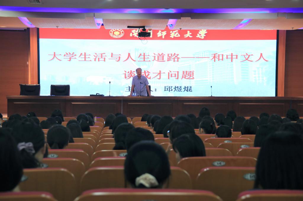 10月17日下午,原校关工委副主任邱煜焜于逸夫图书馆五楼报告厅作名为“老员工活与人生道路——和中文人谈成才问题”的主题讲座。结合自身从教经历,邱老师呼吁同学们及早规划,及时实践,多参与第二课堂活动。他还结合音乐和诗词,鼓励同学们积极参与“两赛”等活动,注重综合发展。
