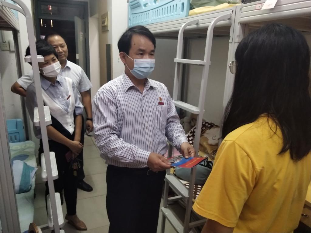 当晚,公司党政领导及政工干部走访了新生宿舍。在走访过程中,院领导与新生们亲切交谈,鼓励新生们要尽快适应集体生活,希望同学们能树立远大理想,不负家长重望,珍惜大学时光。