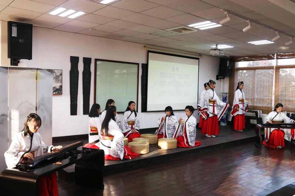 黄金明开场致辞,他回忆泠音琴社成立五年来的成长与成绩,高度肯定师生五年来的坚守与奋斗。随后,情景剧《鹿鸣》拉开汇演序幕。“花径不曾缘客扫,蓬门今始为君开”,弦歌《客至》表达对诸客的热烈欢迎。风自清,月自明,酒自烈,茶自香,《秋风词》诵出心有留念意,奈何不由己的忧愁。一曲《静夜思》道出月下故乡归思难收、香炉烟气往昔依旧的哀思,引观众追昔故旧。《阳关三叠》唱出只恐“西出阳关无故人”的烦恼。茶香清甜洌,味苦后甘,《喜园中茶生》吟出涤尽烦尘的宁静。品诗如品人生,《诗词串唱》将高韬隐士于自然佳境中的怡然之情娓娓道来。琴鼓表演《关山月》则将边关壮士离乡戍边、驰骋疆场的的豪情壮志融入诗词之中。又是一年春色好,灼灼桃花开,《桃夭》融情于景,表露出待嫁新娘的娇羞。只愿故人去,尽赏春光好,弦歌《黄鹤楼》《春光好》再现诗意的送别。以琴奏曲,以心绘图,一首《拉纤歌》叙说着我国古代劳动人民生活的喜悦与辛酸。《调琴啜茗图》表现出古代贵族妇女品茗听琴的悠闲生活。翩翩公子,窈窕佳人,原是郎才女貌,天造地设,却终是香消玉殒,说琴情景剧《梦断沈园》引观众重温旧时陆游与唐婉凄美的爱情故事。最后,一曲气势恢宏的《大学》吟唱为本次汇演画上圆满的句号。