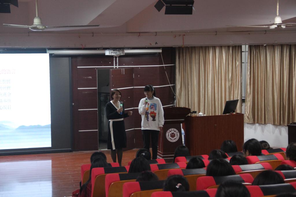 张教授分别从美的语言、美的文字及朗诵和朗读三个方面带领大家反复揣摩文字之美,体会朗诵的艺术化表达。讲座伊始,张教授从语音美、语声美、语情美、语意美和语态美五个层面诠释了美的语言,并通过毕淑敏等大家的经典文段与同学进行诵读互动,赢得了阵阵掌声,将全场的气氛推向了高潮。随后,她从多角度分析朗诵和朗读的作用,解析二者的关系,引领大家用美的语言朗诵美的文字。她提到,朗读与朗诵是学习普通话的有效途径,能够检测普通话的声韵调及音变,还是教育和教学的有效形式。此外,张教授还通过舒婷的《致橡树》、《祖国啊,我的祖国》,马如琴的《小河》,余烬先生的《秋天,携诗来看我吧》等诗歌与同学们互动,并对参与互动的同学进行现场指导,进一步强调了朗诵和朗读的技巧。讲座尾声,张教授邀请肖老师和在场的员工进行师生合诵,呼吁中文学子开拓展示自我,在朗诵中绽放出独特的魅力。