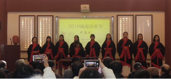 实训开始前,泠音琴社成员亮相龙人书院大型文化交流活动“2019闽南诗歌节·诗与祖国”开幕式,以弦歌《客至》拉开了帷幕。琴声人声悠扬婉转,场下听众不禁微笑颔首。