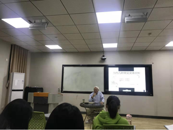 11月5日上午9点到11点,何镇邦教授在博东406做题为“小说文体的审美特征概述”的主题演讲,采用东西方对比的方式,给大家讲解文体、文体意识和文体学,并与在座的各位老师同学进行了深入对话、交流。
