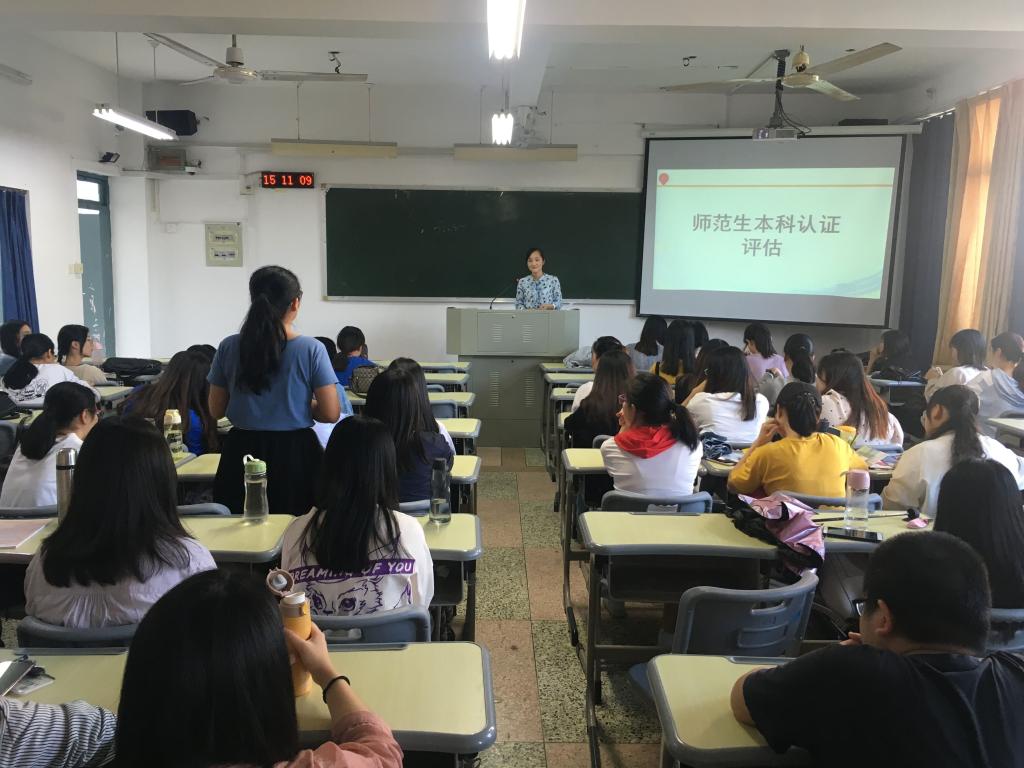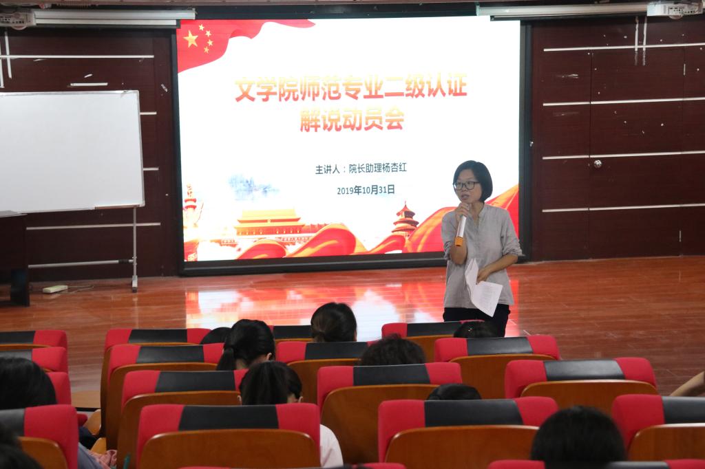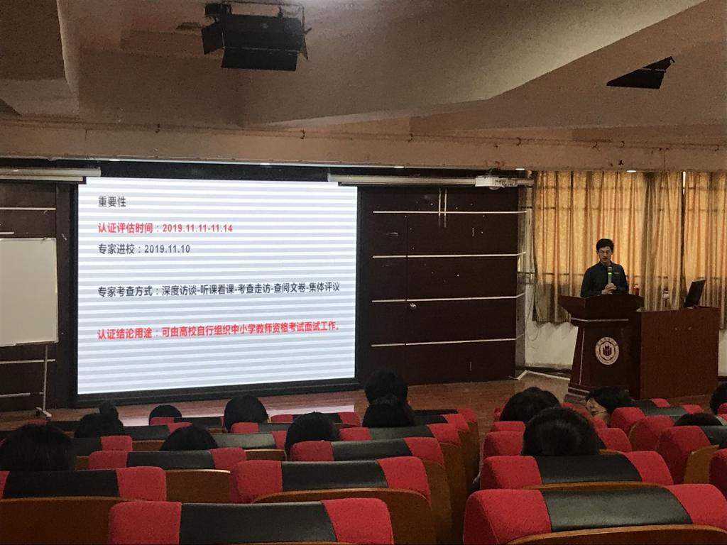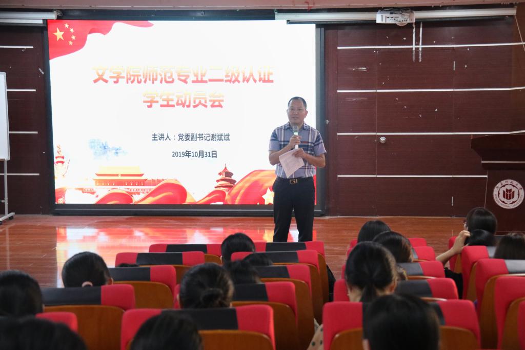 10月31日,16级师范专业和17级师范专业、18级师范专业分别于下午4:30和5:15在博西梯一教室召开动员会。19师范专业动员会于11月3日晚上7:00在博西梯一教室举行。会上,谢斌斌强调了本次汉语言文学(师范)专业认证对pa娱乐游戏提高人才培养质量,促进师范公司产品改革,推动长远发展的重要意义,他希望全体同学以本次认证为契机,对照“一践行三学会”的要求,强化教师技能,提升综合素养,充分展现汉语言文学(师范)专业员工的专业素质和精神风貌,以最佳的精神状态和充分周到的准备迎接专家组的到来。
