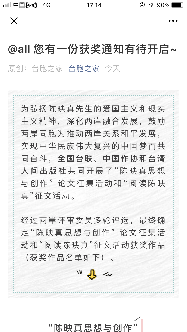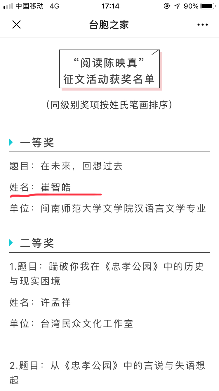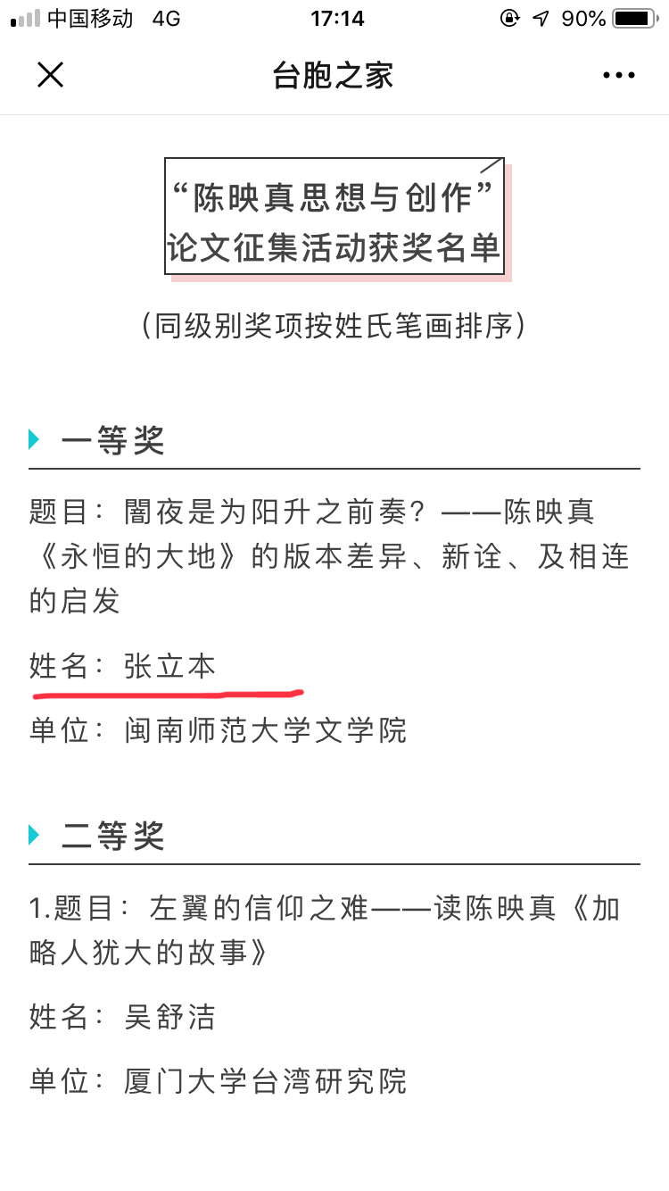 近日,全国台联、中国作协和台湾人间出版社公布了“陈映真思想与创作” 论文征集活动和“阅读陈映真”征文活动获奖名单。pa娱乐游戏共有两项作品斩获一等奖,其中张立本老师的“闇夜是为阳升之前奏?——陈映真《永恒的大地》的版本差异、新诠、及相连的启发”获得“陈映真思想与创作”论文征集一等奖,崔智皓同学的“在未来,回想过去”获得“阅读陈映真”征文活动一等奖。