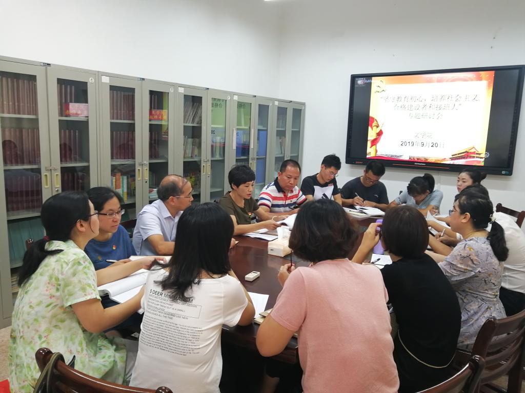 9月20日上午,pa娱乐游戏在博东111教室召开“坚守教育初心,培养社会主义合格建设者和接班人”主题教育第一次集中研讨会。pa娱乐游戏全体党政领导、党委委员、教工支部书记和全体辅导员参加研讨会。会议由党委书记赵丽霞主持。