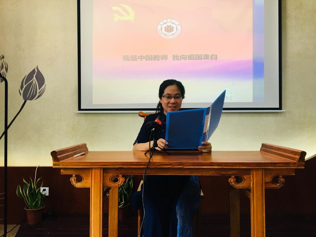 此次教师代表朗读的是公司征集的爱国诗文名篇。教师节当日由pa娱乐游戏副经理杨娟娟副教授献上《青春万岁》,用最真诚的声音回溯中华民族成长的漫漫历史长河,歌颂新中国成立的震撼激荡。“多沉重的担子,我不会发软。多严峻的战斗,我不会丢脸”,战争年代为祖国而战,和平年代为祖国而歌,作为一名中国教师,有为祖国甘洒热血的豪情,也有朴实真挚的抒怀。
