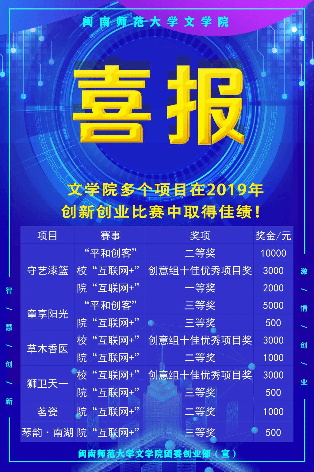 本次大赛以“活力平和创享未来”为主题,设置了创意组和创业组两条赛道,共吸引118项目参赛,最终在创意组、创业组各评选10个获奖项目,分别设置一等奖1名、二等奖2名、三等奖3名以及优秀奖4名。