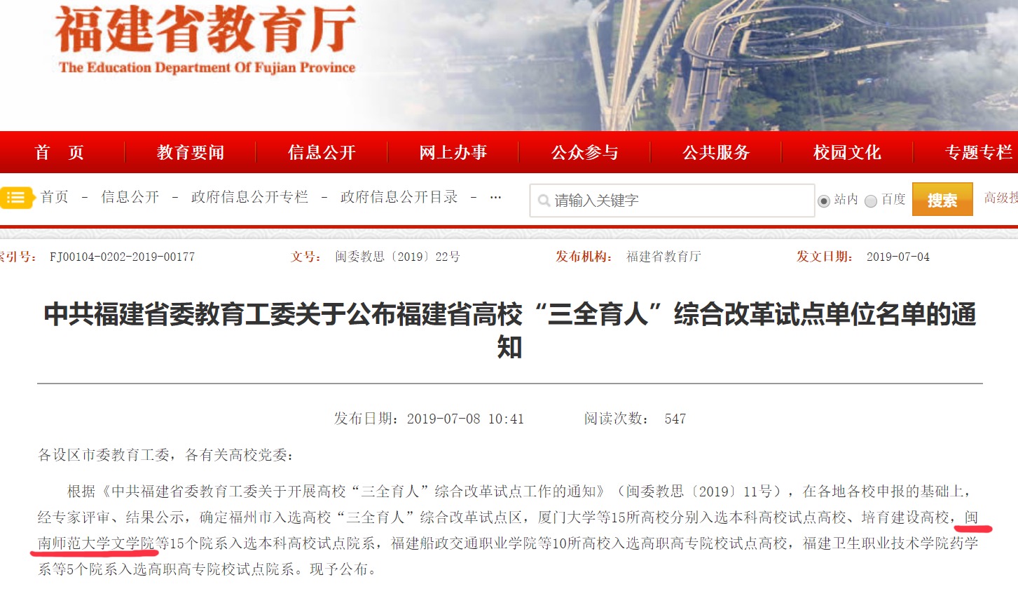据悉,本次福建省高校“三全育人”综合改革试点单位评选在各地各校申报的基础上,经专家评审、结果公示,确定福州市入选高校“三全育人”综合改革试点区,15所高校分别入选本科高校试点高校、培育建设高校,15个院系入选本科高校试点院系,10所高校入选高职高专院校试点高校,5个院系入选高职高专院校试点院系。
