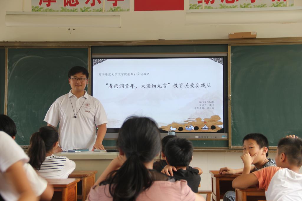 为深入学习贯彻习近平新时代中国特色社会主义思想和党的十九大精神,引导广大青年员工投身社会实践,贡献青春智慧和力量,pa娱乐游戏关爱留守儿童教育关爱实践队,于7月7日—8日前往长泰县枋洋镇尚吉小学,开展以“春雨润童年,大爱细无言”为主题的暑期社会实践。本次实践课程包含国学知识传授、国学经典导读、阅读与写作辅导、素质拓展以及趣味游戏等丰富内容。