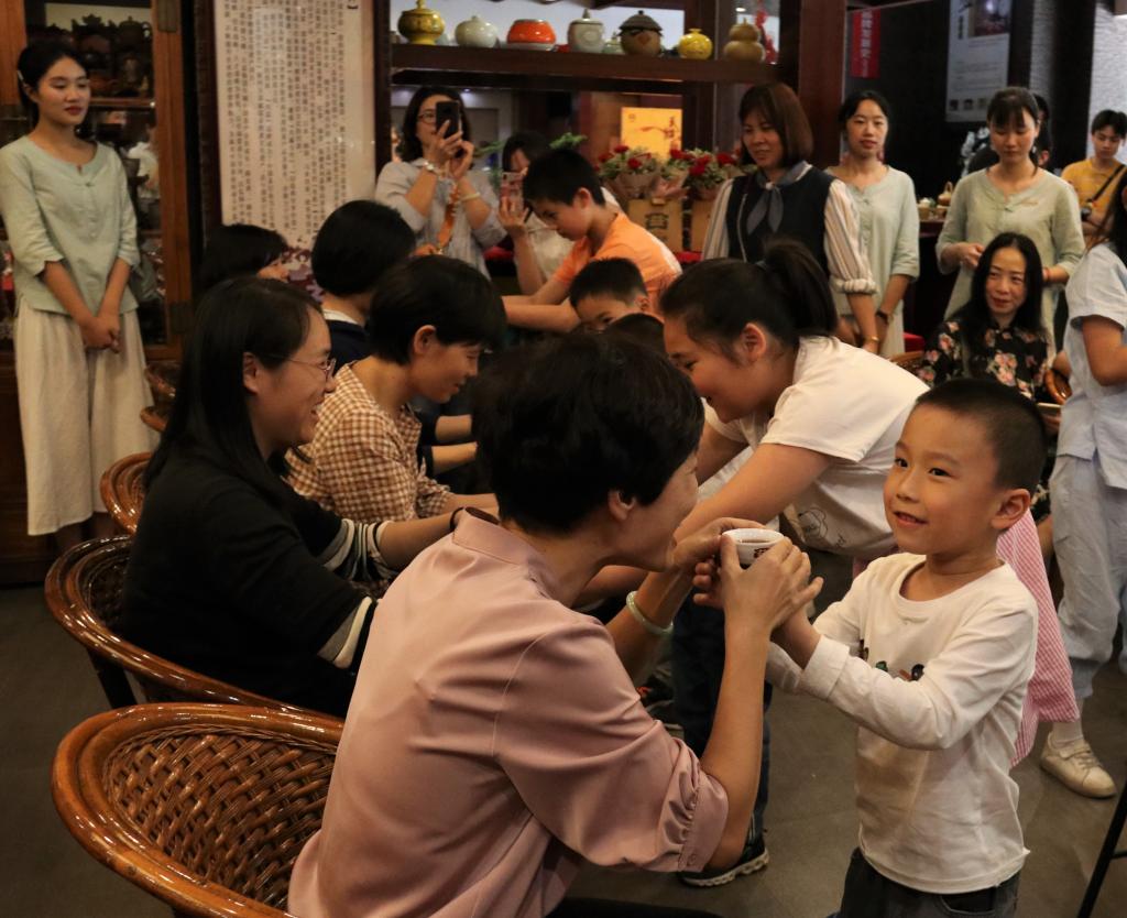 看着红浓的茶汤从精致的茶壶斟至月光白瓷的品茗杯中,温暖浓情…pa娱乐游戏“朗朗读书班”的少儿们围坐嬉笑,迫不及待地端起茶杯奉给亲爱的妈妈。“举杯齐眉高,弯腰鞠真礼”,小茶人在云水茶协成员的指导下专注地投入奉亲仪式,递出祝福,传出真爱。