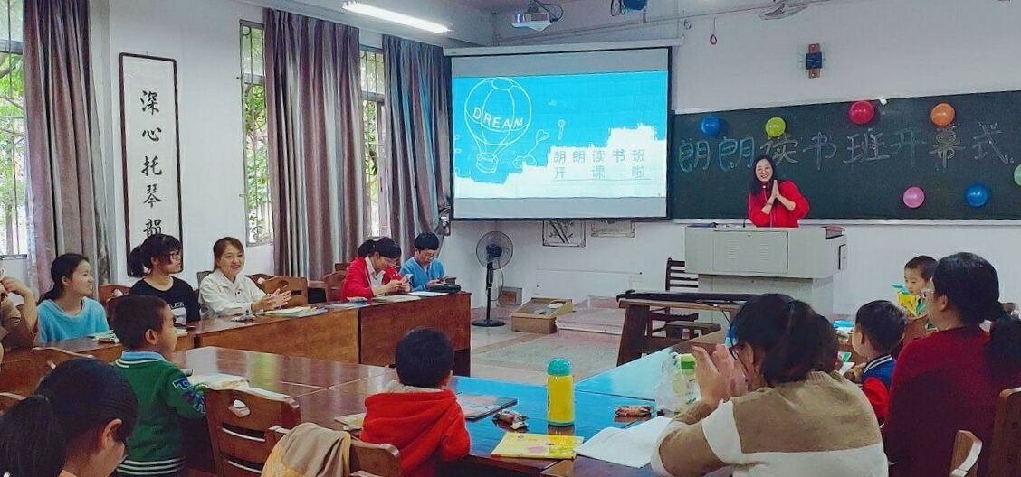 首先,泠音琴社以古风典雅的弹唱开场,诗情画意的表演顿时吸引住小朋友的注意力。接着由肖模艳老师上台发言,她感谢三年来志愿者和教职工对陪伴阅读活动的支持,介绍了本学期的活动规划并表达了希望。随后,读书班的小朋友们和志愿者们两两搭配分成了六组并上台作自我介绍,在志愿者的帮助下,小朋友们由青涩害羞变得爽朗大方、热情活跃。志愿者跟小朋友们互动演绎了舞蹈《咖喱咖喱》、歌曲串烧、你比我猜、成语竞猜等小游戏,彼此快速熟悉,现场充满欢声笑语。最后,小朋友们在志愿者的陪伴下阅读绘本,沉浸在书中,享受阅读乐趣。
