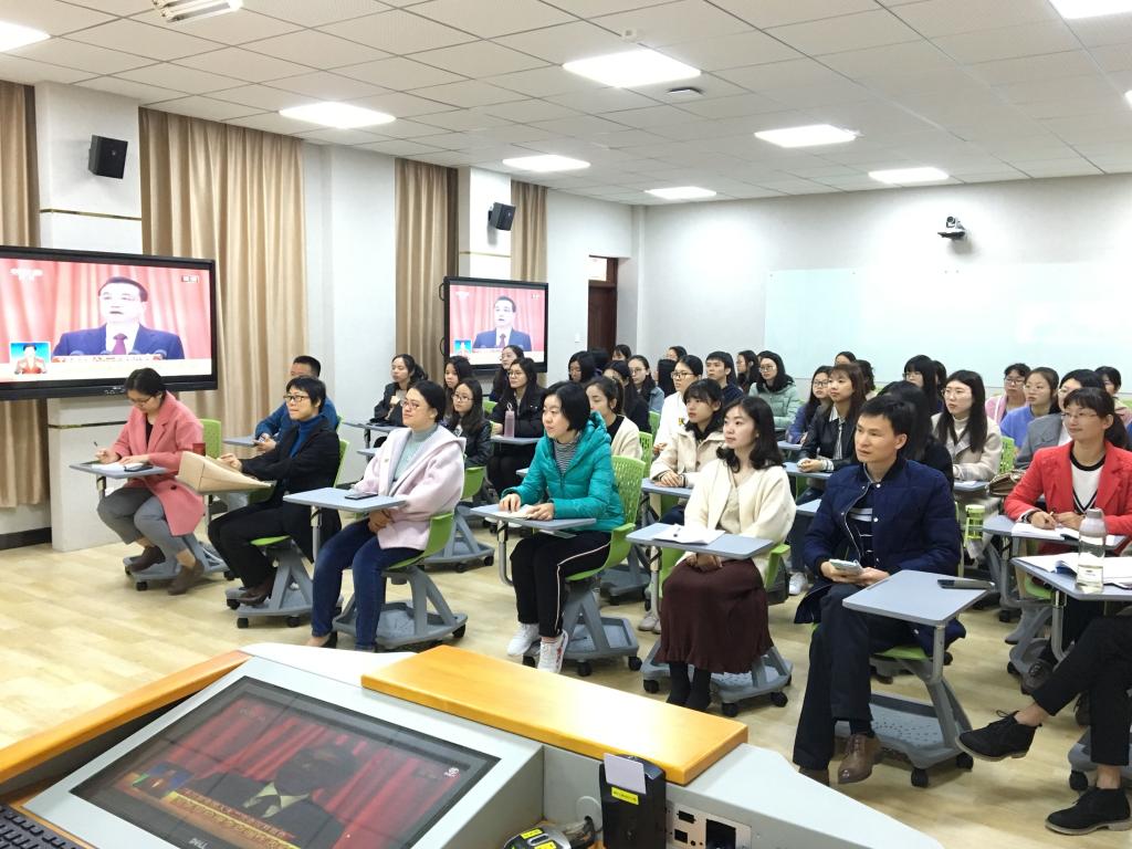 3月5日上午9点,公司党委组织教工党员、员工党员50余人在博东107智慧教室集中收看第十三届全国人民代表大会第二次会议开幕和李克强总理作《政府工作报告》的实况直播。党员同志端坐观看,认真做笔记。直播结束后,党员同志围绕经济社会发展和教育改革发展抒发感想,撰写学习心得,纷纷表明要以实际行动把“两会”精神落实到学习、工作、生活中。
