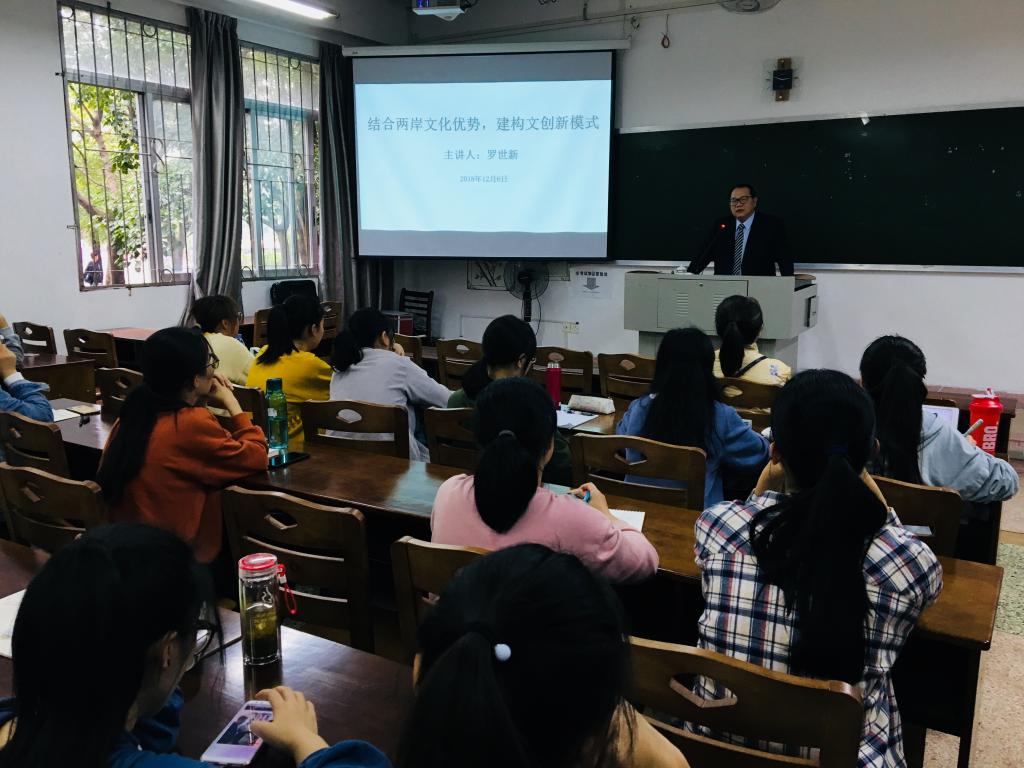 为进一步提升老员工文创思维,加强两岸文化交流,促进文创新模式的借鉴交流与发展,12月6日下午,“结合两岸文化优势,建构文创新模式 ”主题讲座在博东108教室召开。pa娱乐游戏师生近50人参加了此次讲座。