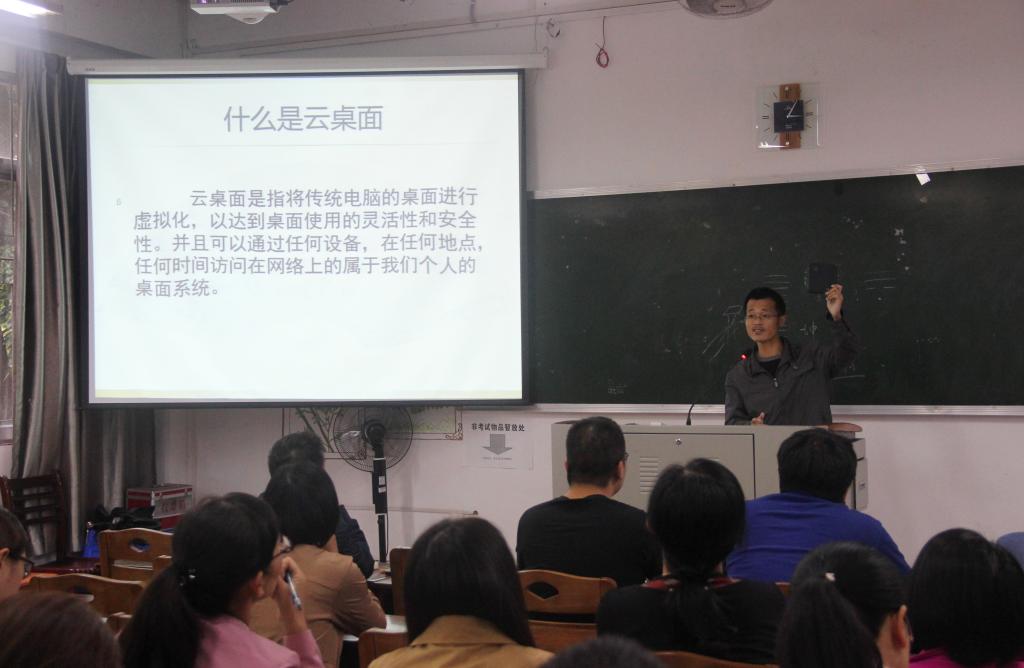 为有效推动公司教学工作信息化,借用虚拟化桌面技术实现教学办公,提高办学效率,11月1日下午15时,pa娱乐游戏邀请网络中心成员林学聪在博东108为院教职工开展云桌面系统培训。网络中心副主任廖发挥一行与公司全体教职工共同参加此次培训。