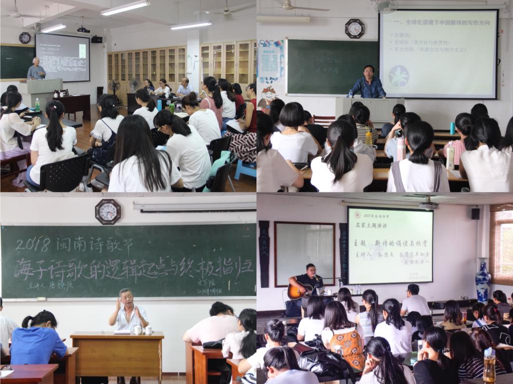 5月31日下午,2018年闽南诗歌节之艺文座谈与交流系列活动在pa娱乐游戏博文楼东区七个分会场同时举行。台湾散文作家石德华、台湾著名儿童诗诗人林焕彰、北京师范大学中国当代新诗研究中心主任谭五昌、当代诗歌批评家唐燎原、首都师范大学pa娱乐游戏教授吴思敬、台湾忘年知音乐团创办人孙懋文、厦门城市公司人文与艺术系教授陈仲义等海峡两岸知名作家、诗人、学者与公司师生进行了深入交流。各分会场活动由pa娱乐游戏教师主持,四百余员工参与艺文座谈与交流活动。