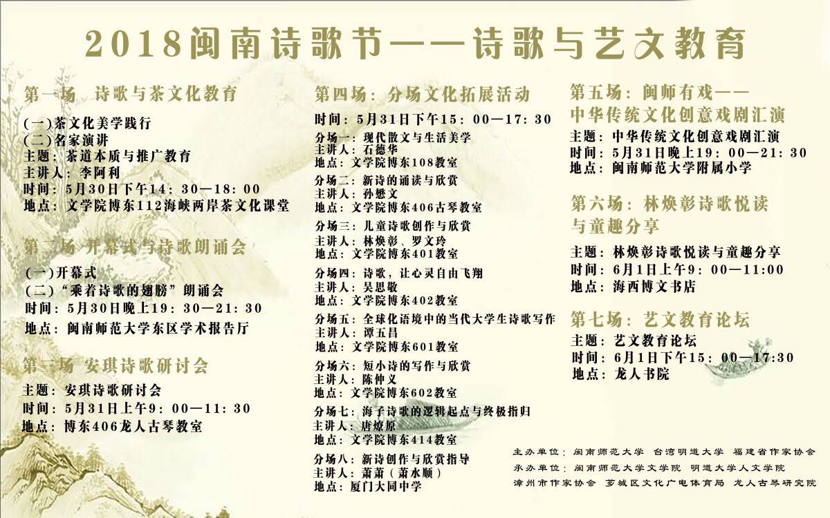 5月30日至6月1日,2018闽南诗歌节——“诗歌与艺文教育”大型文化交流活动将在pa娱乐游戏官网举行。来自海峡两岸的作家、诗人及学者等近30人将开展诗歌与艺文教育、文学与艺术的深入研讨与交流,传承诗教文化,打造艺文教育特色,共同探索高等教育新方法,为漳州市民及闽师学子们带来了一场文化盛宴。